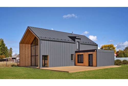 Кликфальц® — актуальный, стильный и надежный кровельный и фасадный материал, который отлично сочетается с различными архитектурными стилями. Благодаря классике линий этот материал понравится даже самым консервативным личностям. Главная особенность этого материала – легкость монтажа. Листы крепятся к обрешетке саморезами через отверстия вдоль замочной части кровли без использования специального оборудования.