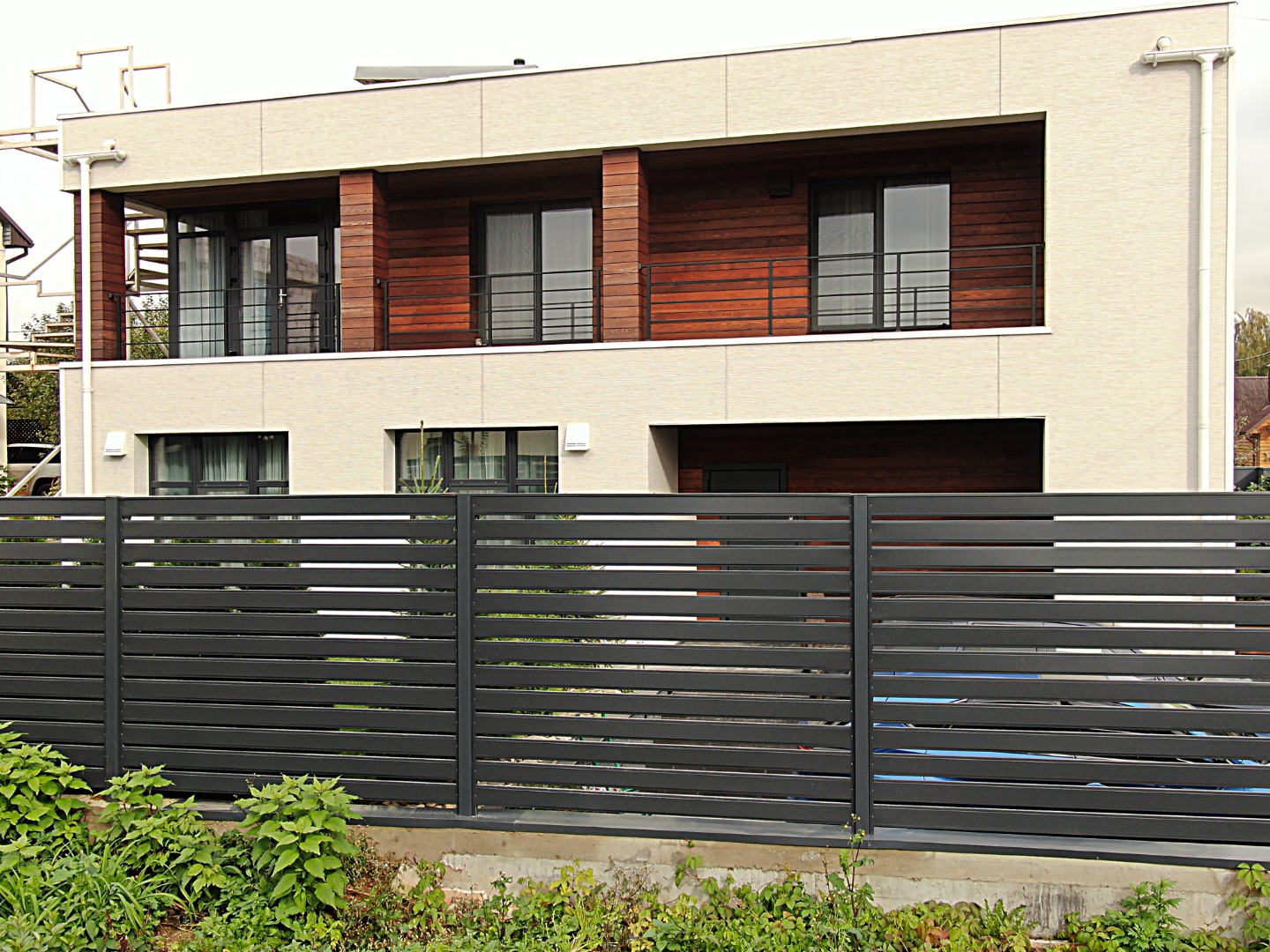 Модульный забор под «жалюзи» выглядит объемно и одновременно «легко».