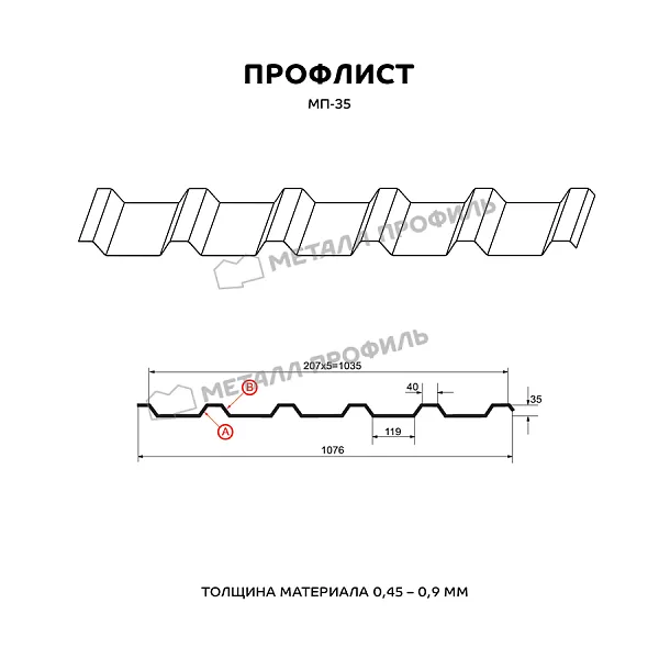Профлист МЕТАЛЛ ПРОФИЛЬ МП-35x1035-B (ПЭ-01-7024-0,7) часто используется для оформления профилированного листа. Изначально он представляет собой лист оцинкованной стали с покрытием. Толщина металла с оцинковкой и декоративно-защитным слоем — 0.7 мм. После проката на специальном оборудовании металл приобретает рисунок из ритмичных волн. Несущая способность такого листа на порядок выше плоского.Профиль МП-35: