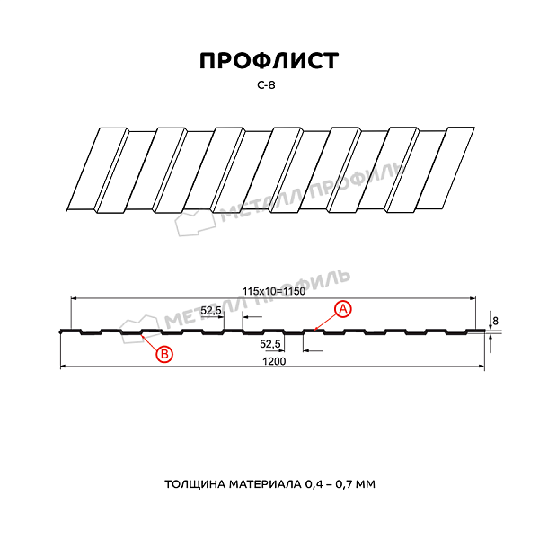 С-8 – наименее рельефный и экономичный профиль. Его способность противостоять большим нагрузкам сравнительно невелика, поэтому такой профиль не применяется в сооружениях, где необходима повышенная жёсткость. Чаще всего С-8 применяют для облицовки фасадов, а также для строительства ограждений и монтажа потолков. Обладая маленькой высотой – всего 8 мм – одновременно он имеет самую большую рабочую ширину – 1150 мм. Чаще всего на производство С-8 берётся металлопрокат толщиной от 0,4 до 0,7 мм. Это подходящие толщины для обшивки стен или устройства ограждений в районах с отсутствием порывистых ветров. Для вспомогательных конструкций ( туалетов, сараев, бытовок, времянок) можно заказать профлист без полимерного покрытия толщиной 0,35 и менее мм, чтобы сэкономить, когда есть необходимость.Покрытие Matt MP®: